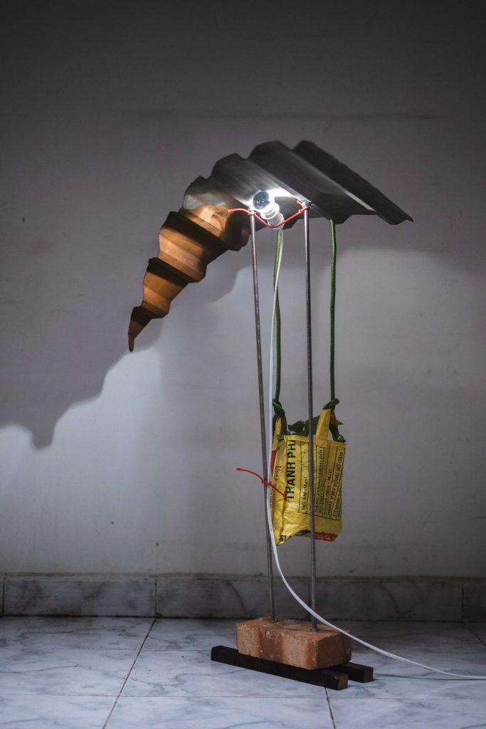 建築の解体という行為を、物質の消失ではなく構造と時間の“再定義”として捉えながら、トタンなどの建築部材を用いた制作を展開している。解体は建築が抱えてきた機能や物語を?ぎ取り、その下層に潜在していた空間の位相や力学を露わにする契機となる。私はその臨界点に生じる微細な変化を読み取り、作品として再編成することで、日常と非日常の境界に沈潜する生のリズムを可視化しようとしている。そこでは、建築が単なる人工物としてではなく、環境に応答し、痕跡を残しながら呼吸する存在として立ち現れる。その瞬間を媒介するための装置として、作品は観者に空間そのものの可逆性と、建築が内包する時間的厚みを経験させる場となる。