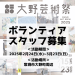 - 大野芸術祭 OHNO ART BREW 2025 ボランティアスタッフ募集のお知らせ常滑市大野町を舞台に開催される「大野芸術祭2025」において、運営をサポートいただけるボランティアスタッフを募集いたします。アートイベントの裏側を体験しなが …